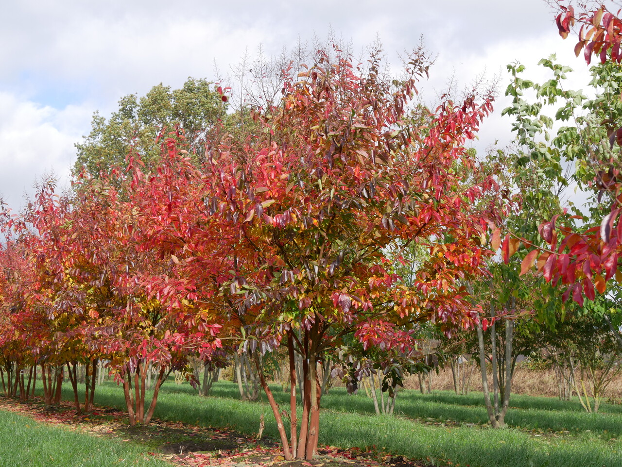 Bladene til Lagerstroemia 'Natchez' blir gul, oransje, rød om høsten.