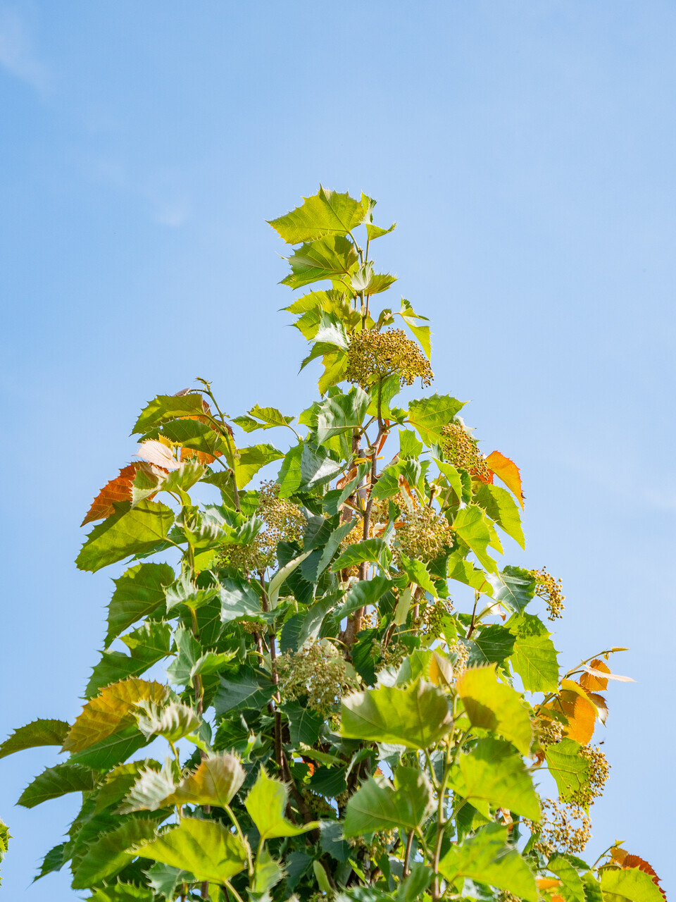 in pendulous umbels, Ø 10 - 15 cm, yellowish white, July/September, round to oval , fragrant flowers