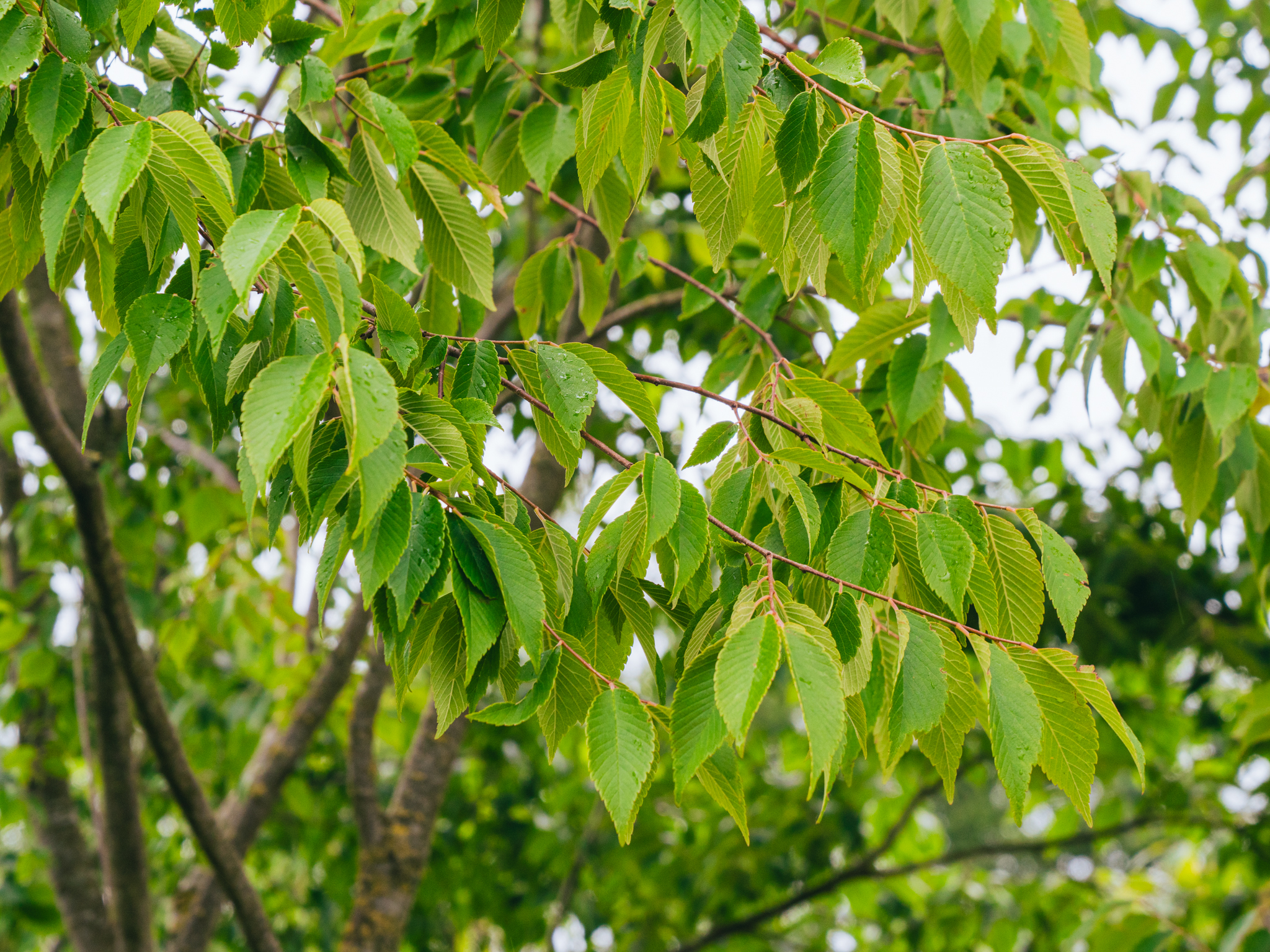 Middels til stort tre med en oppreist, bred, eggformet krone, 8 til 15 m høyt. De tynne, unge kvistene er grå og hårløse. Den gamle barken er også grå, og senere slipper den i lag, slik at den oransje til lysebrune underbarken kommer til syne. Det litt krokete bladet er ovalt avlangt til elliptisk avlangt og mørkegrønt. Bladkanten er takket. Oversiden er svært grovhåret, undersiden gråhåret. Bladet er noe læraktig å ta på. Under gunstige forhold kan det bli brunrødt om høsten. Treet blomstrer under eller like etter løvsprettingen med iøynefallende grønne blomster, etterfulgt av små ovale frukter. Et nydelig parktre som også egner seg godt i brede grøntbelter og andre brede profiler. Trenger beskyttelse i harde vintre når det er ungt.